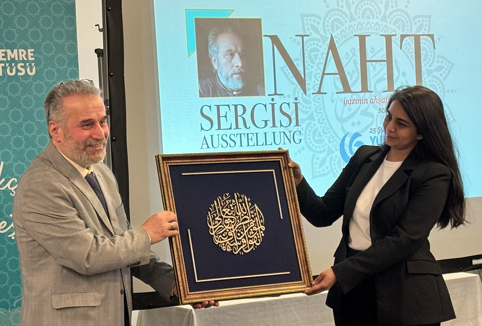 Yunus Emre Enstitüsü Almanya Koordinatörü Dr. Samet Kapısız da bu yılın ilk sergisini ahşap işleme sanatı olan naht sanatıyla başlattıklarını ifade ederek, “Tabii, naht sanatı ismi itibarıyla çok bilinmese de cismi itibarıyla aslında asırlardır Türk kültüründe hayatın doğrudan içinde olan bir sanat. Sadece sanat ünüyle değil evlerin içerisinde birçok alanda kullanılan bir dal diyebiliriz. Göze ve gönle dokunan estetik boyutu derin ve ciddi emek isteyen bir sanat” açıklamasını yaptı. Kapısız, Almanya’da yaşayan Türk toplumunu sadece belli alanlarda değil kültür sanat alanında da yetişmiş değerlerle buluşturmayı amaçladıklarını, Türklerin Almanya’nın kültürel zenginliğine ve çeşitliliğine de katkısını göstermek istediklerini ifade etti. Sergide nahhat Hasan Ürkmez’in 40 eseri, sanatseverlerle buluştu.