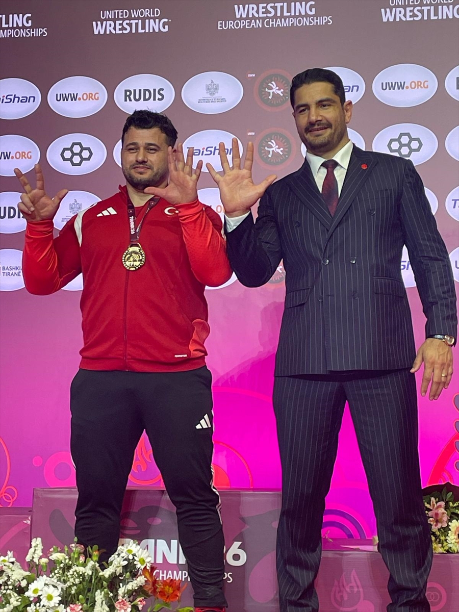 Rıza Kayaalp, Arnavutluk'un başkenti Tiran'daki 2026 Avrupa Güreş Şampiyonası'nın ikinci gününde grekoromen stil 130 kilo finalinde Macar Darius Attila Vitek ile karşılaştı. Dünya ikincisi rakibini 7-1 yenen Milli güreşçi Kayaalp, 13'üncü Avrupa şampiyonluğuna ulaşarak güreş tarihine geçti. Kayalap, düzenlenen törenle madalyasını aldı. Madalya töreni sonrası Türkiye Güreş Federasyonu Başkanı Taha Akgül (sağda) ve Kayaalp ''13'' işareti yaparak şampiyonluğu ve rekoru kutladı.