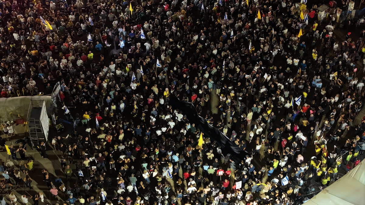 İsrail’in Tel Aviv kentindeki “Rehineler Meydanı”nda toplanan göstericiler, Gazze’deki savaşın sona erdirilmesi ve İsrailli rehinelerin serbest bırakılması talebiyle gösteri düzenledi.