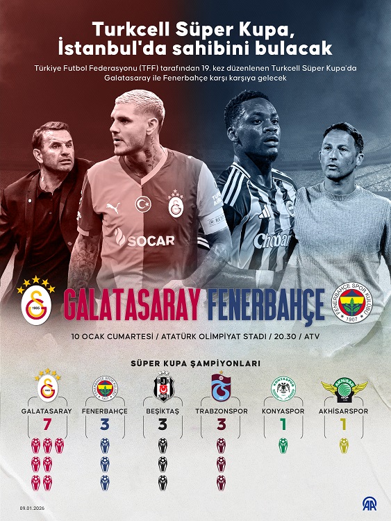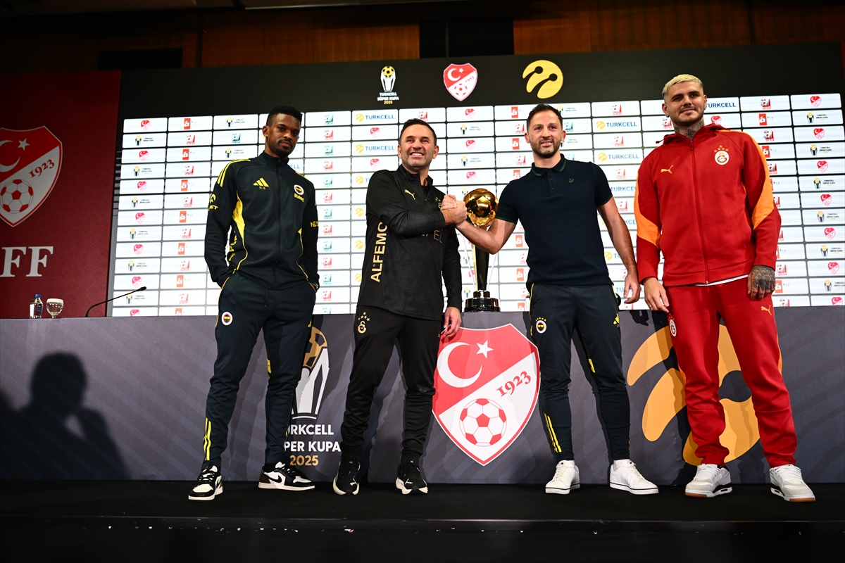 Riva Hasan Doğan Milli Takımlar Kamp ve Eğitim Tesisleri'nde gerçekleştirilen ortak basın toplantısında Fenerbahçe Teknik Direktörü Domenico Tedesco, takım kaptanlarından Nelson Semedo, Galatasaray Teknik Direktörü Okan Buruk ve sarı-kırmızılı ekibin kaptanı Mauro Icardi hazır bulundu.
